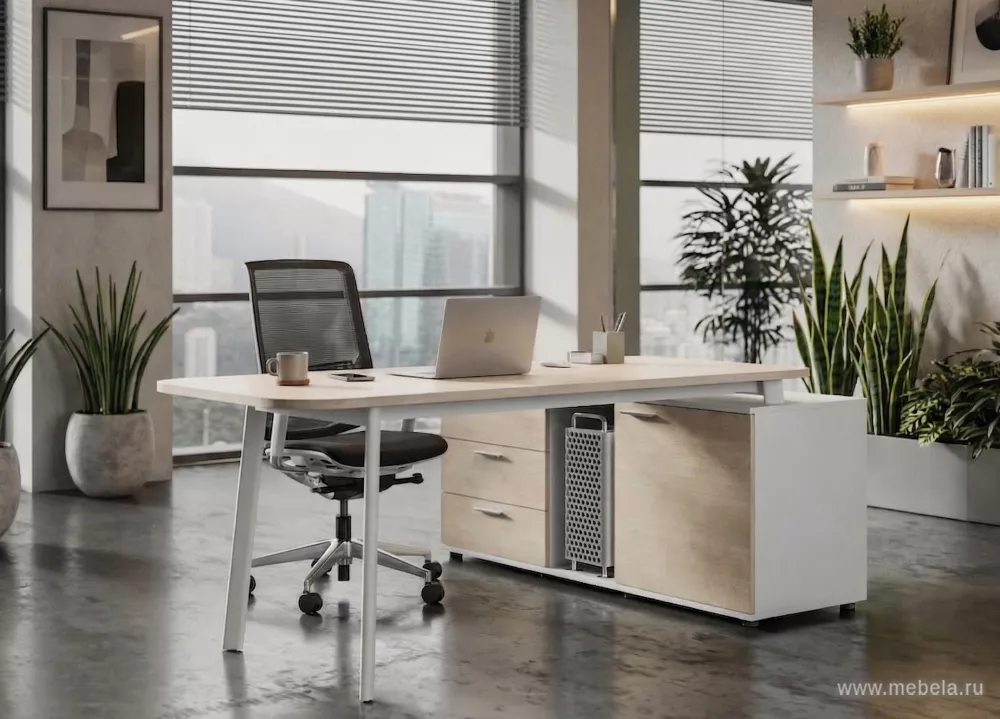 Кабинет Флекс Лайт — это не просто мебель, а целая система, которая отвечает всем требованиям современного руководителя. Столы с трапециевидными ассиметричными столешницами, выполненные из ДСП толщиной 25 мм, обеспечивают достаточную площадь для работы и встреч. Скругленные углы не только добавляют эстетики, но и повышают безопасность. Опорная тумба, выполненная из ЛДСП с толщиной 18 мм, предлагает надежное хранение документов и аксессуаров благодаря продуманным ящикам с плавным закрыванием. Металлические А-образные опоры с порошковым покрытием не только устойчивы, но и легко адаптируются к неровностям пола.