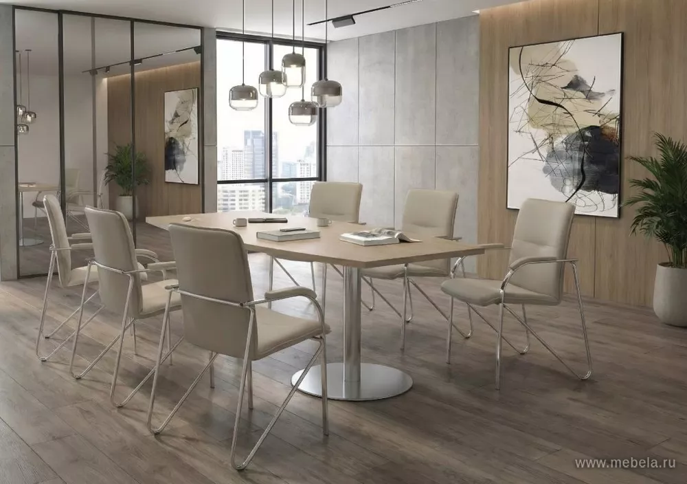 Оригинальное соединение столешниц с боковыми опорами через проставки контрастного серебристого цвета придают кабинету особый шарм. Большой выбор столов разнообразных форм, включая прямоугольные, овальные и круглые, позволяет создать комфортную переговорную зону.