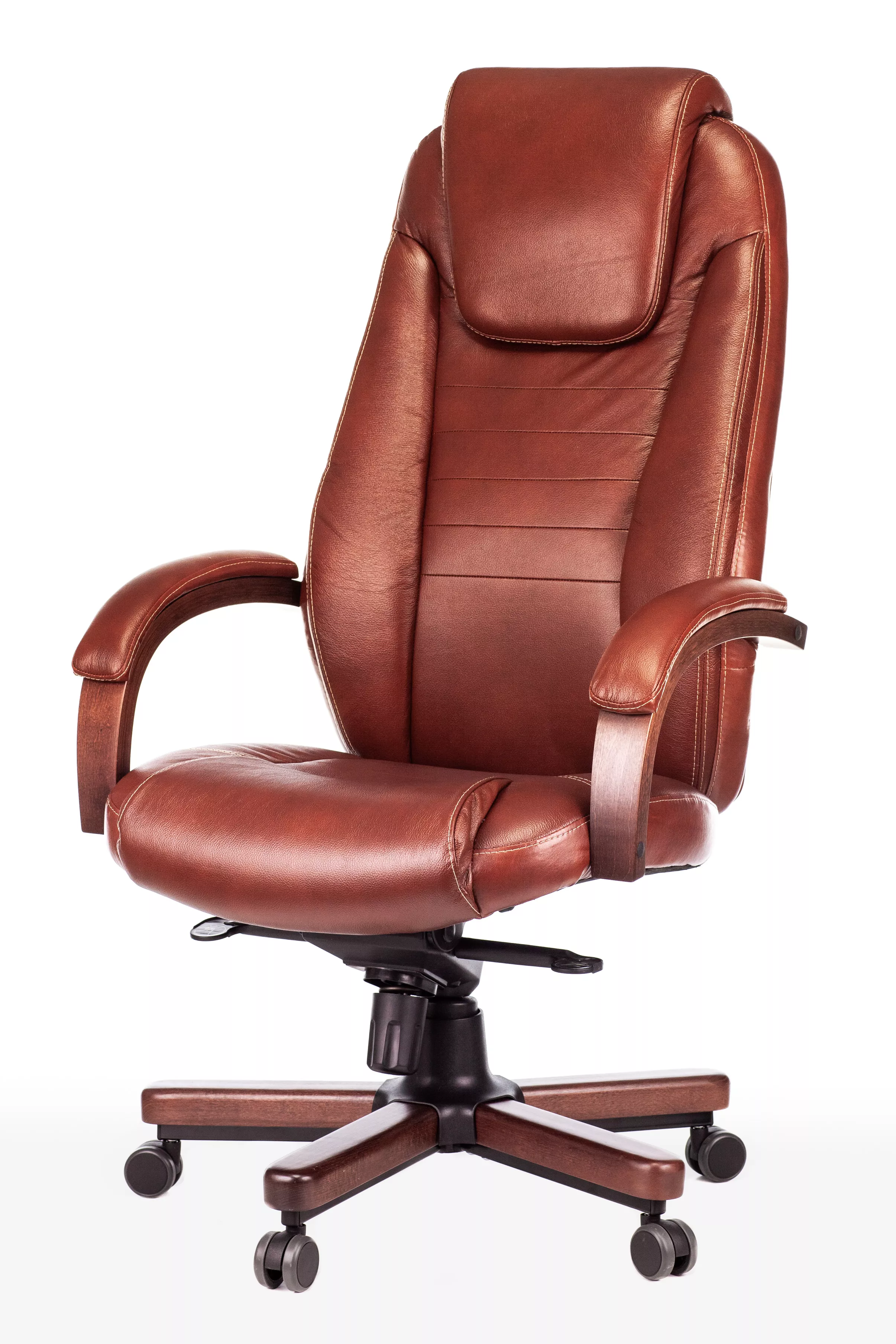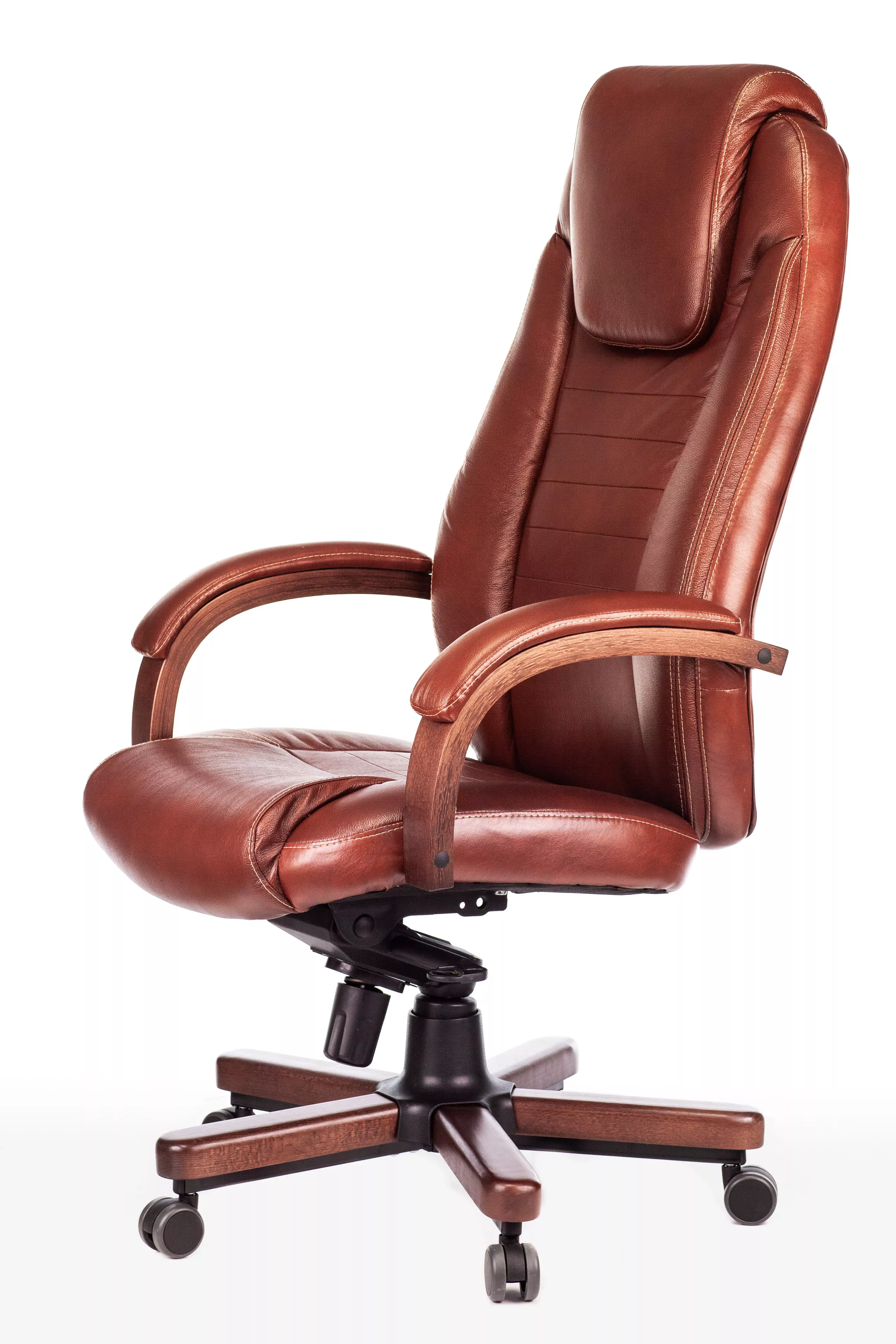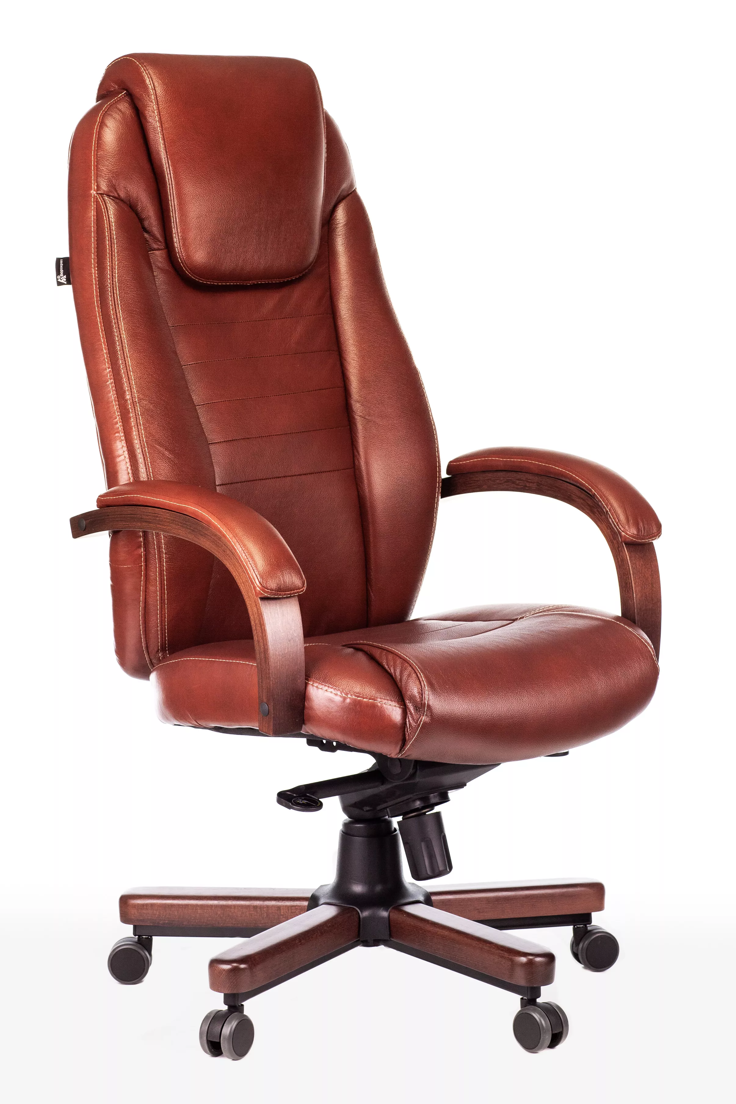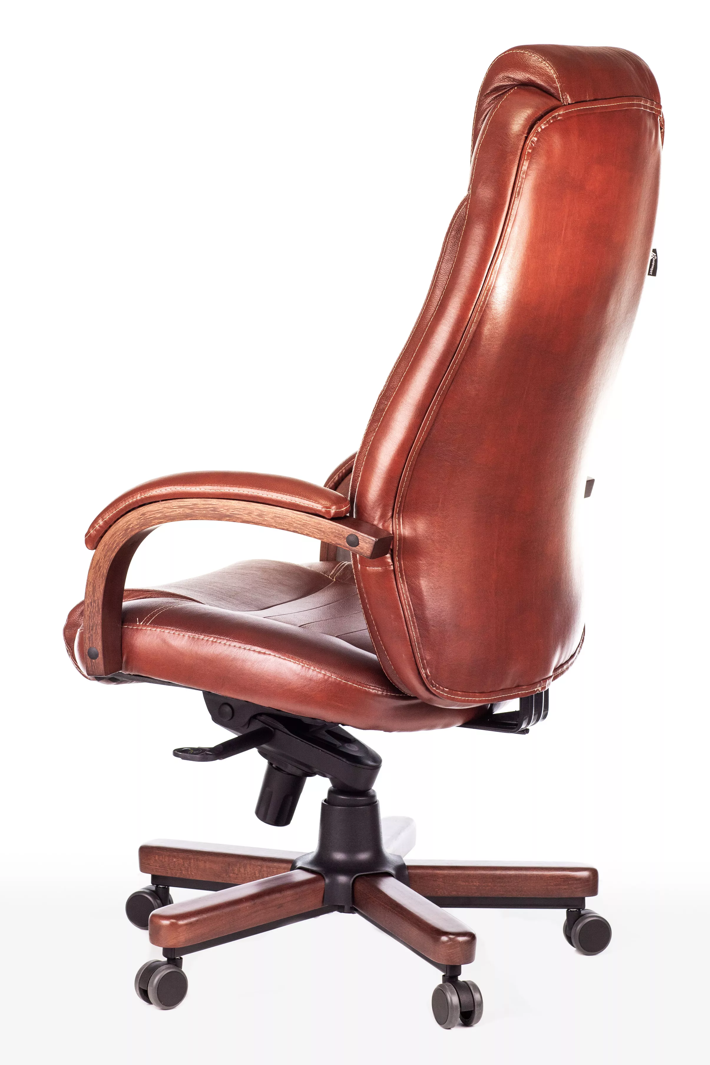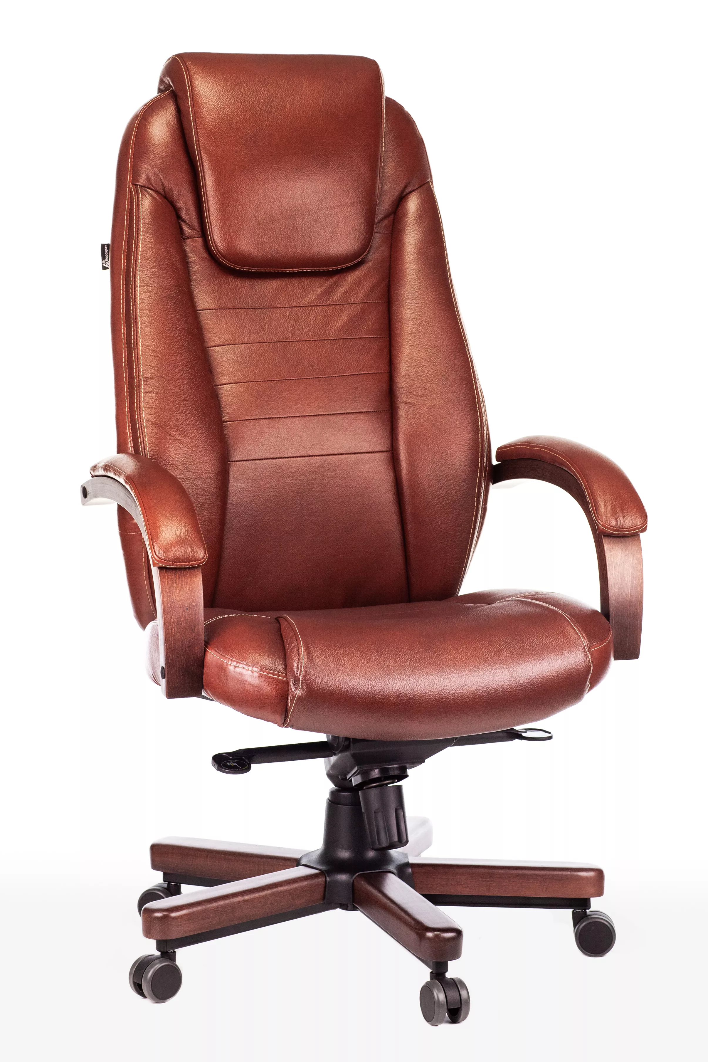 Наполнитель кресла выполнен из эластичного высокоупругого поролона, который обеспечивает мягкость и комфорт при сидении. Подлокотники кресла выполнены из дерева в цвете "темный орех" и имеют мягкие накладки из натуральной кожи на лицевых частях, что добавляет дополнительный комфорт.