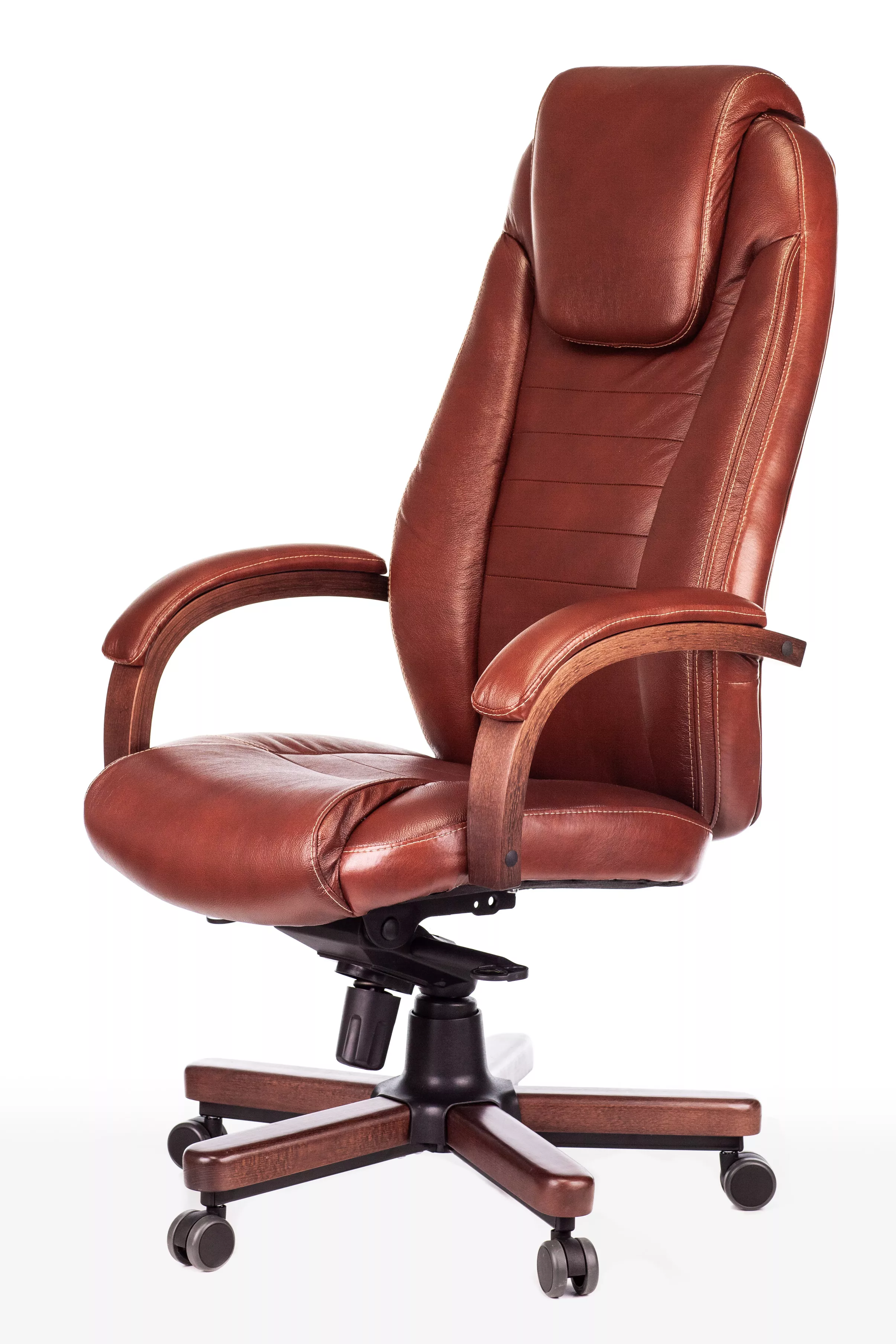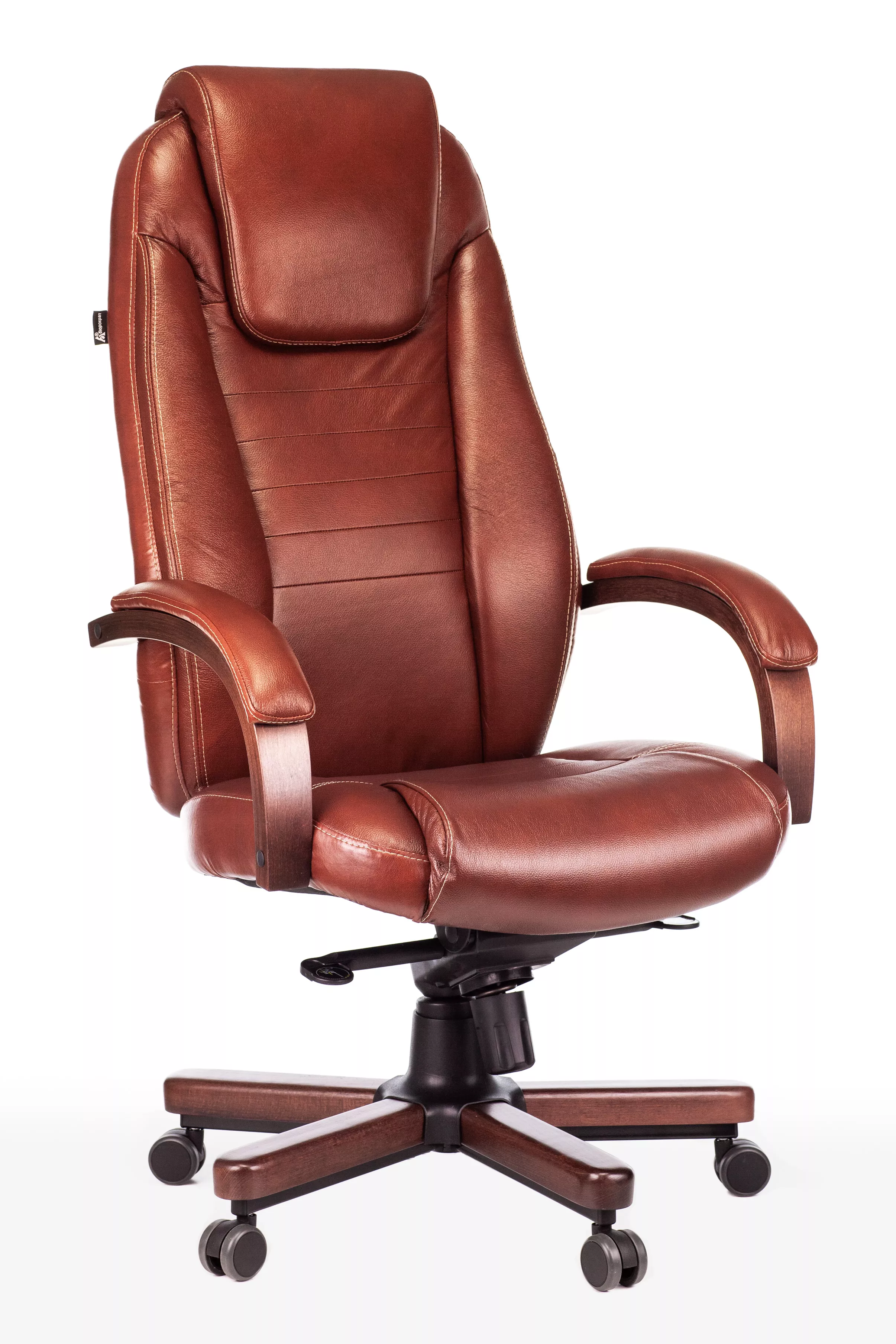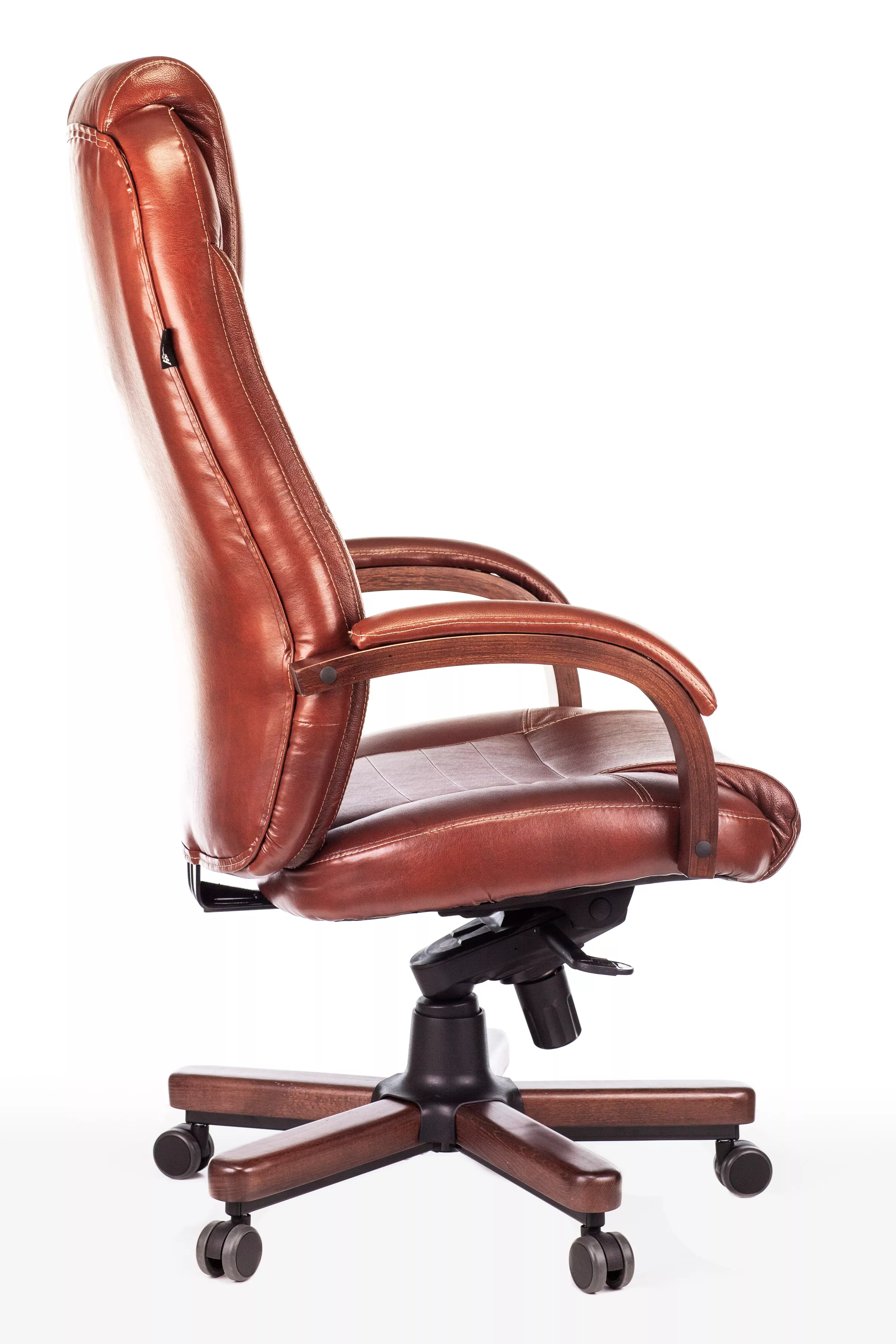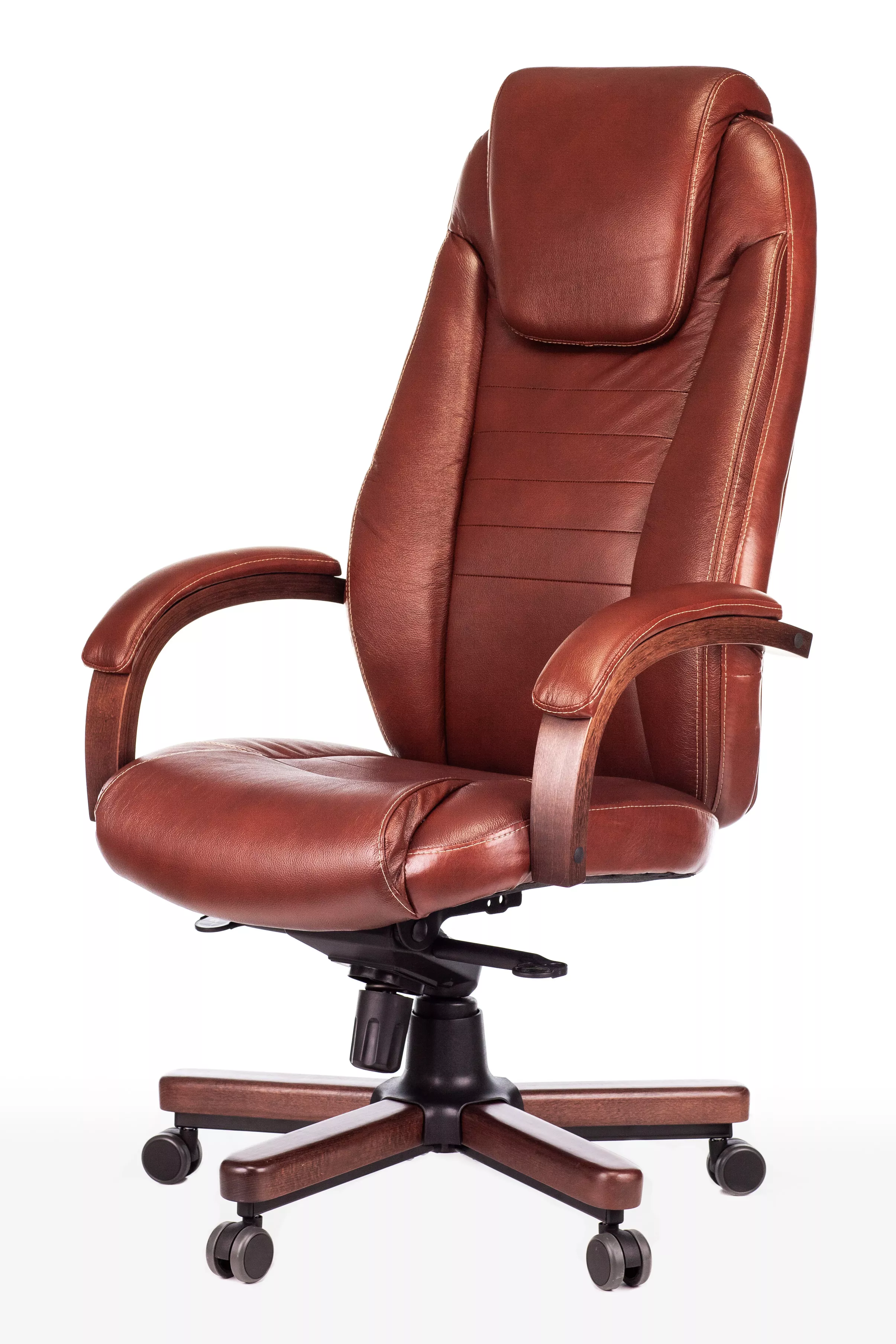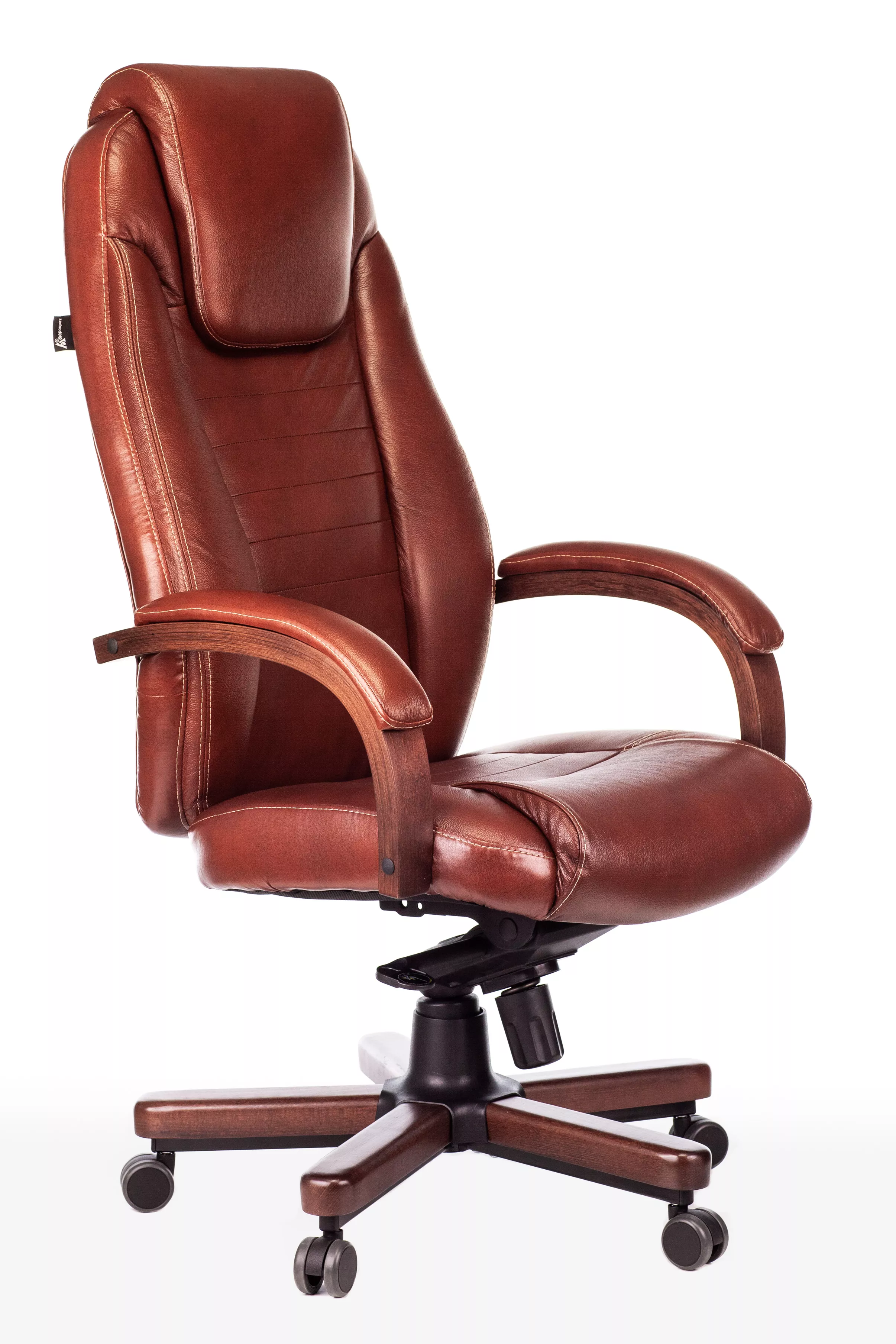 Наполнитель кресла выполнен из эластичного высокоупругого поролона, который обеспечивает мягкость и комфорт при сидении. Подлокотники кресла выполнены из дерева в цвете "темный орех" и имеют мягкие накладки из натуральной кожи на лицевых частях, что добавляет дополнительный комфорт.