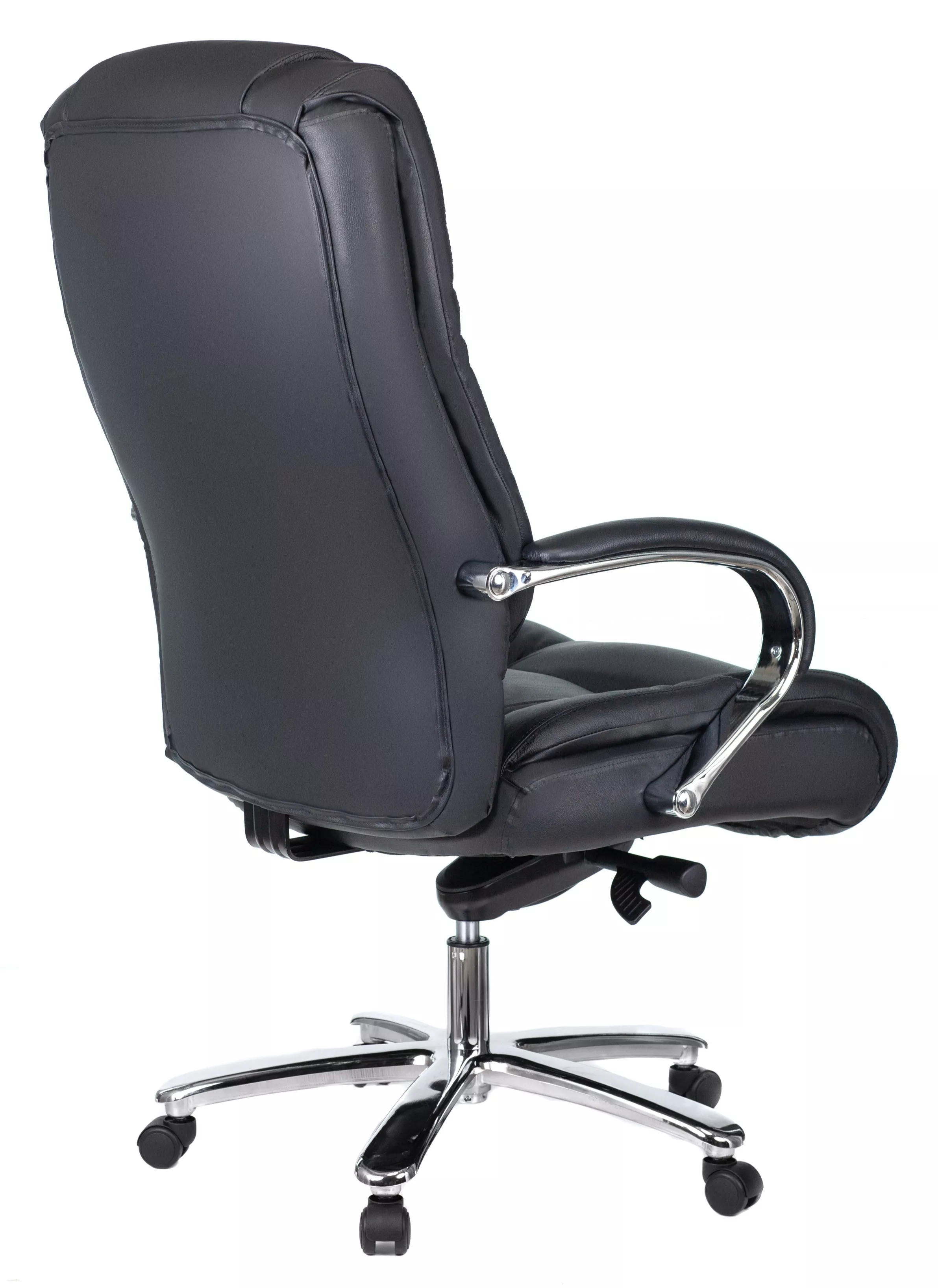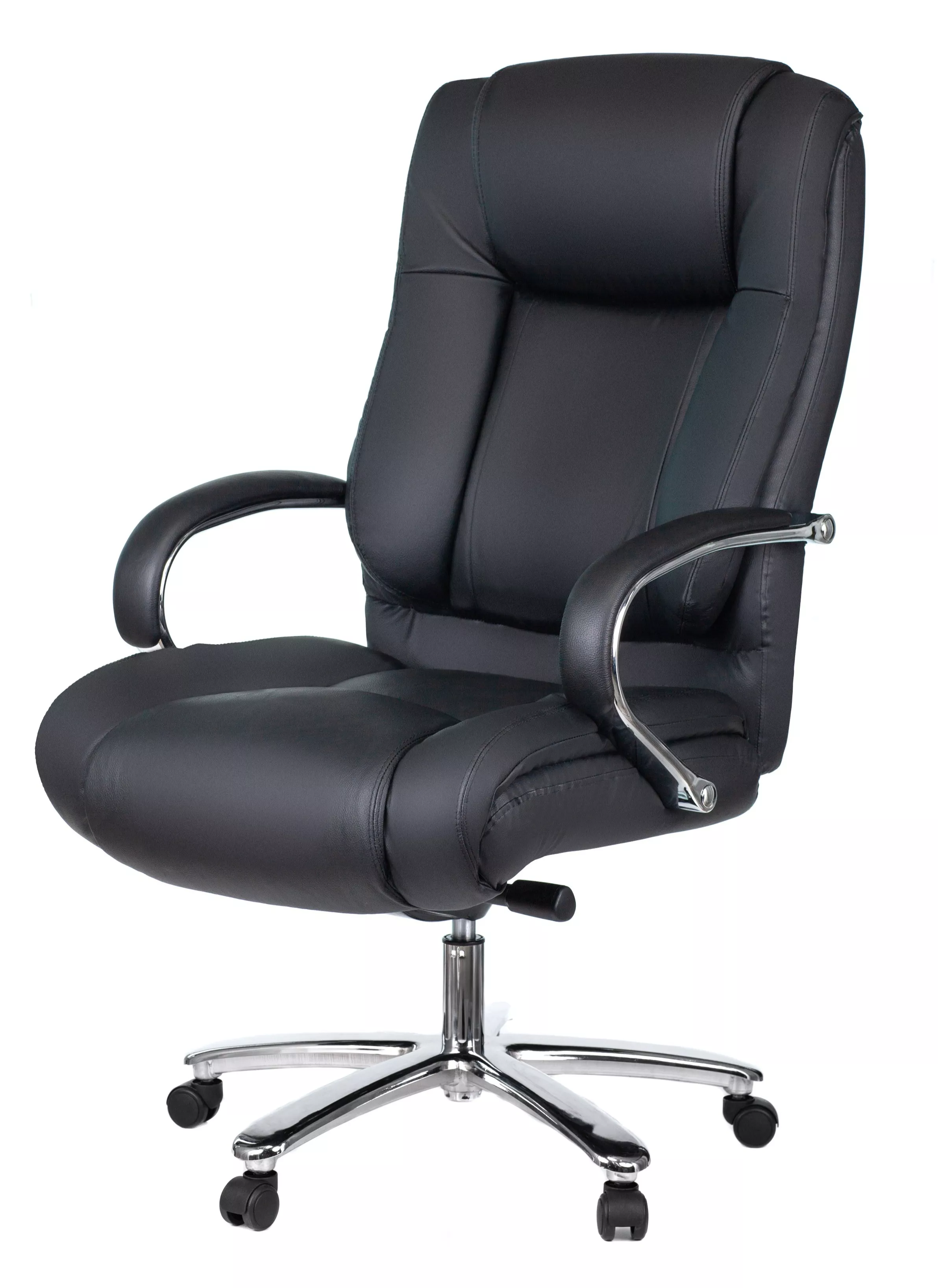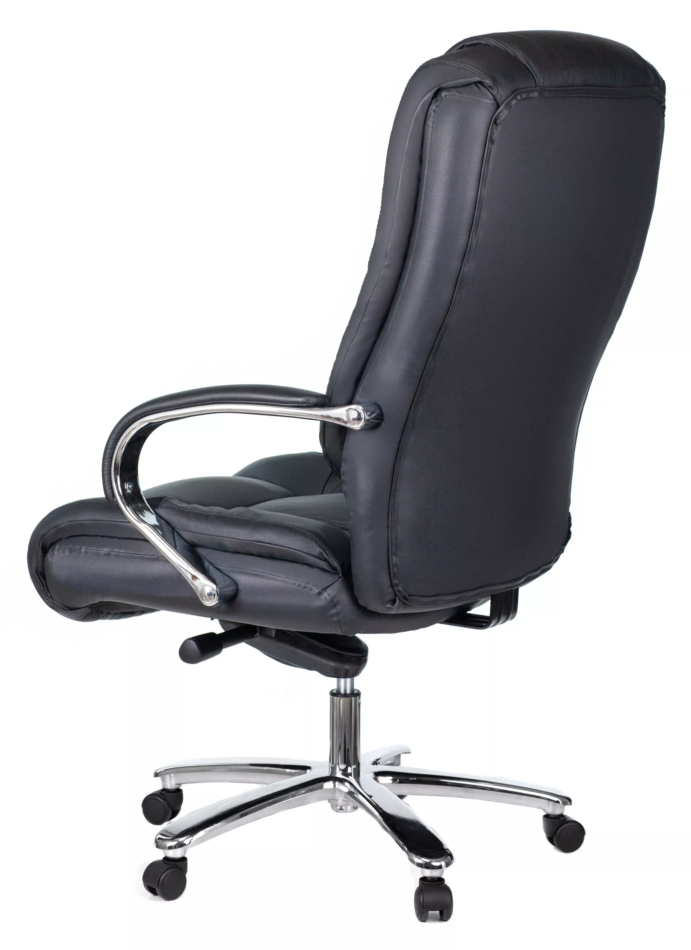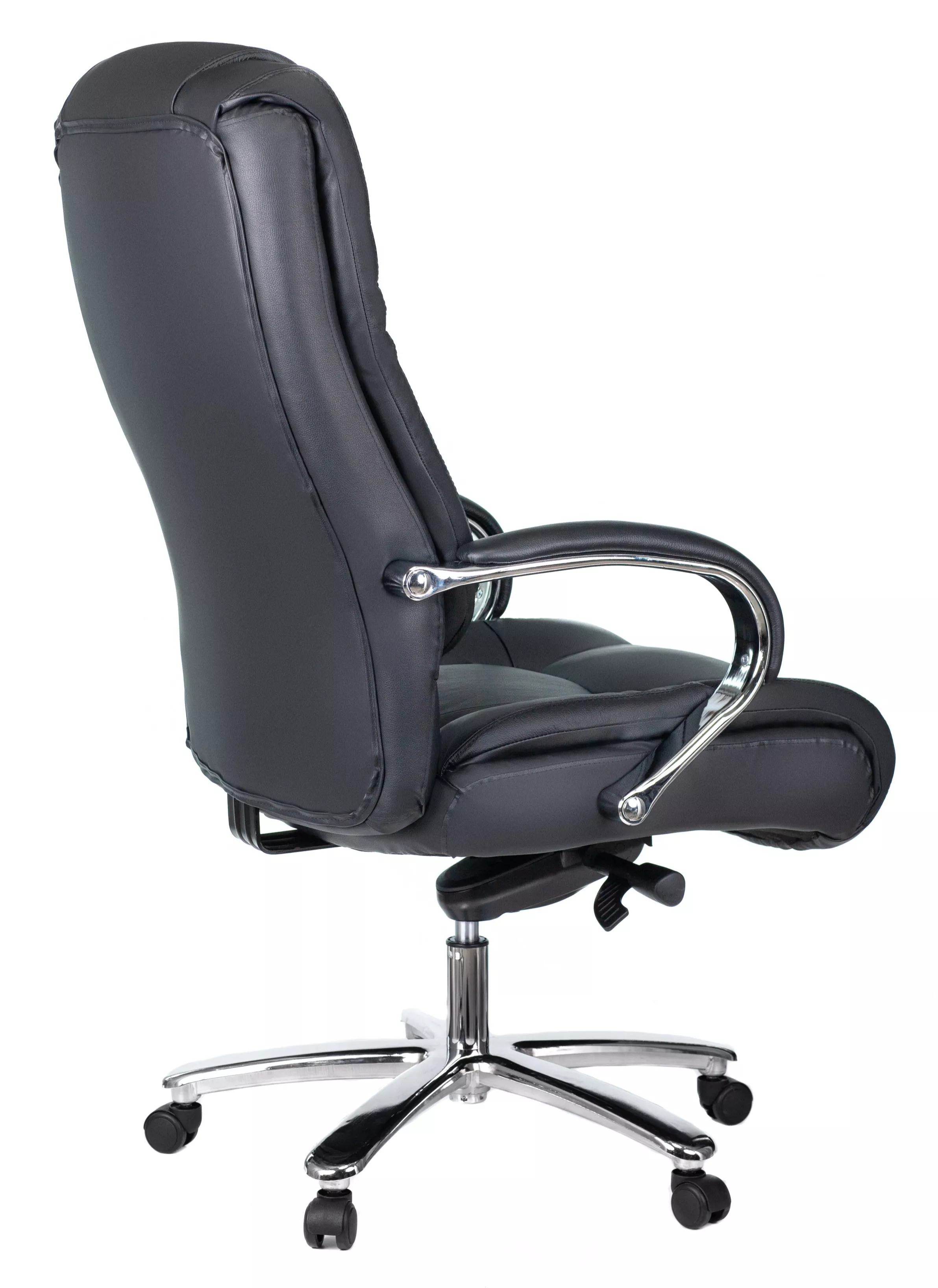 Кресло изготовлено из высококачественной экокожи черного цвета, которая отличается прочностью, гибкостью и долговечностью. Внешнее покрытие выглядит презентабельно и не поддается загрязнениям. Пластиковые колеса подходят для любого покрытия. Они не поцарапают ламинат, линолеум или паркет. Зафикси...