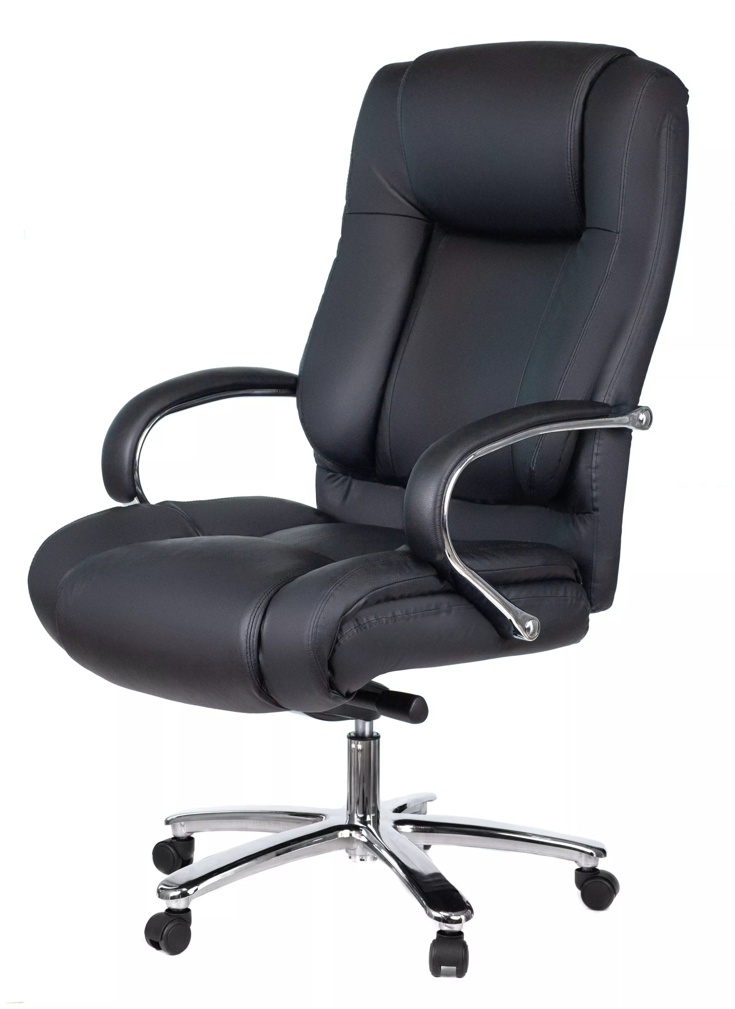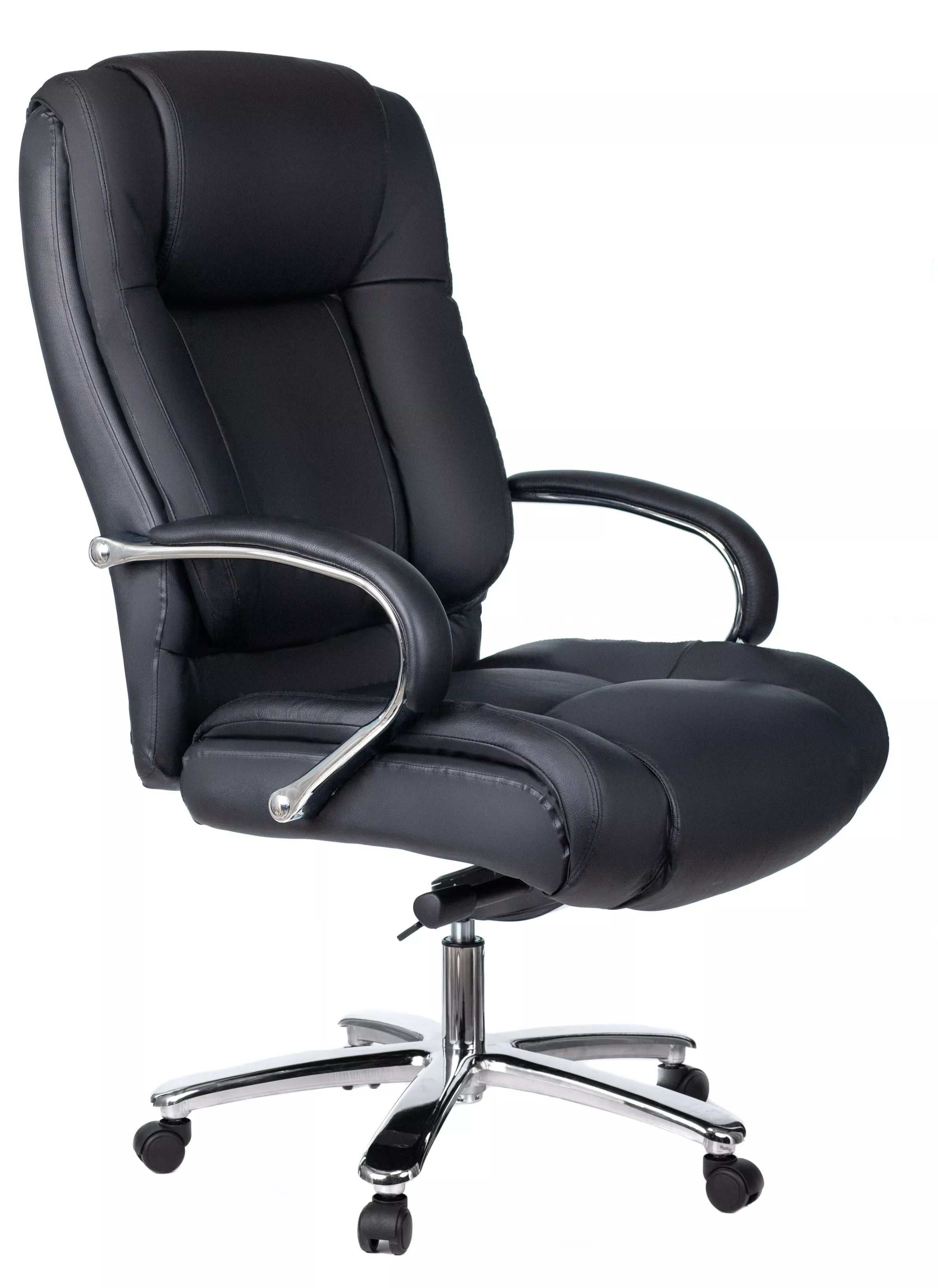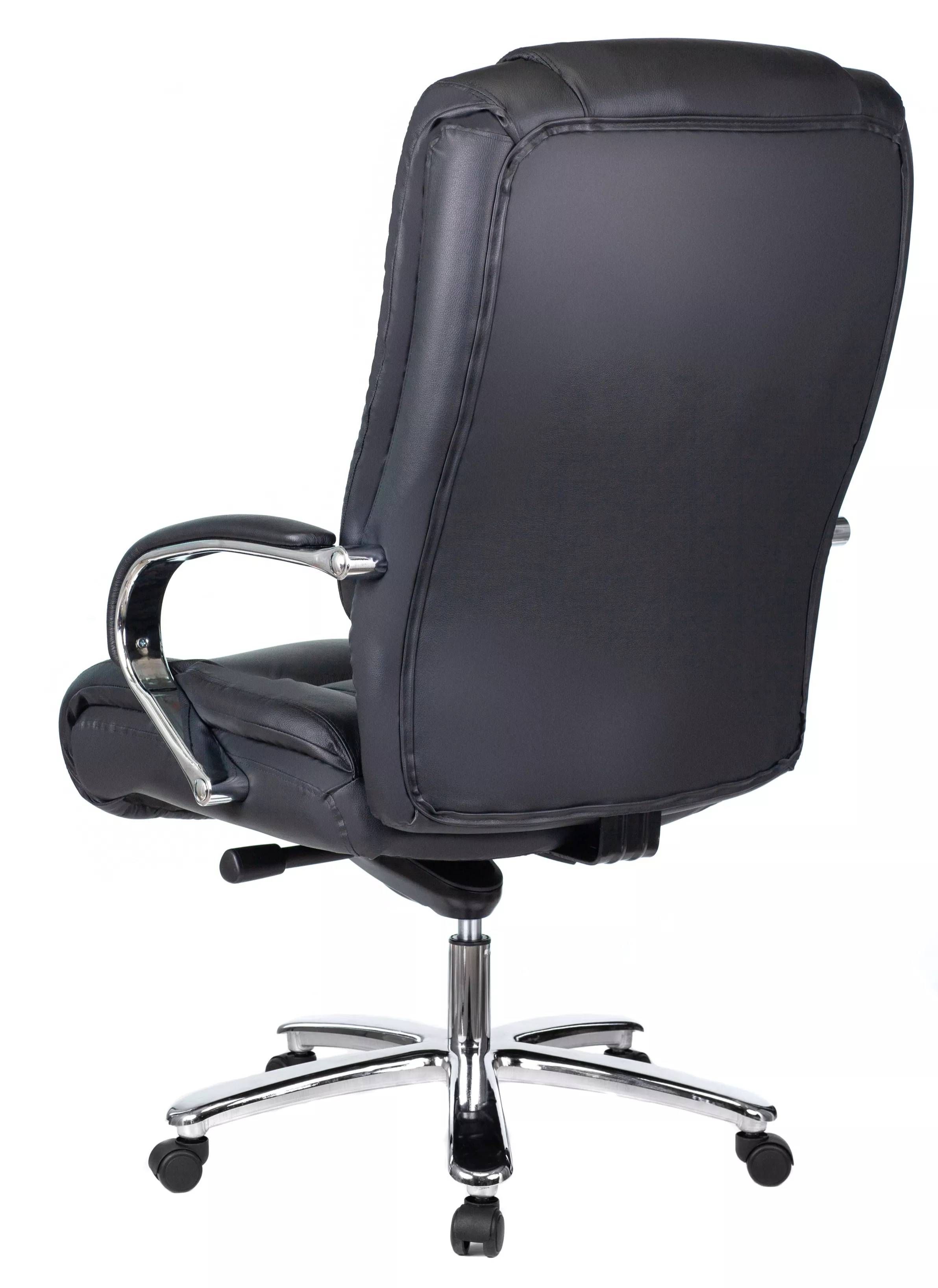 Кресло изготовлено из высококачественной экокожи черного цвета, которая отличается прочностью, гибкостью и долговечностью. Внешнее покрытие выглядит презентабельно и не поддается загрязнениям. Пластиковые колеса подходят для любого покрытия. Они не поцарапают ламинат, линолеум или паркет. Зафикси...
