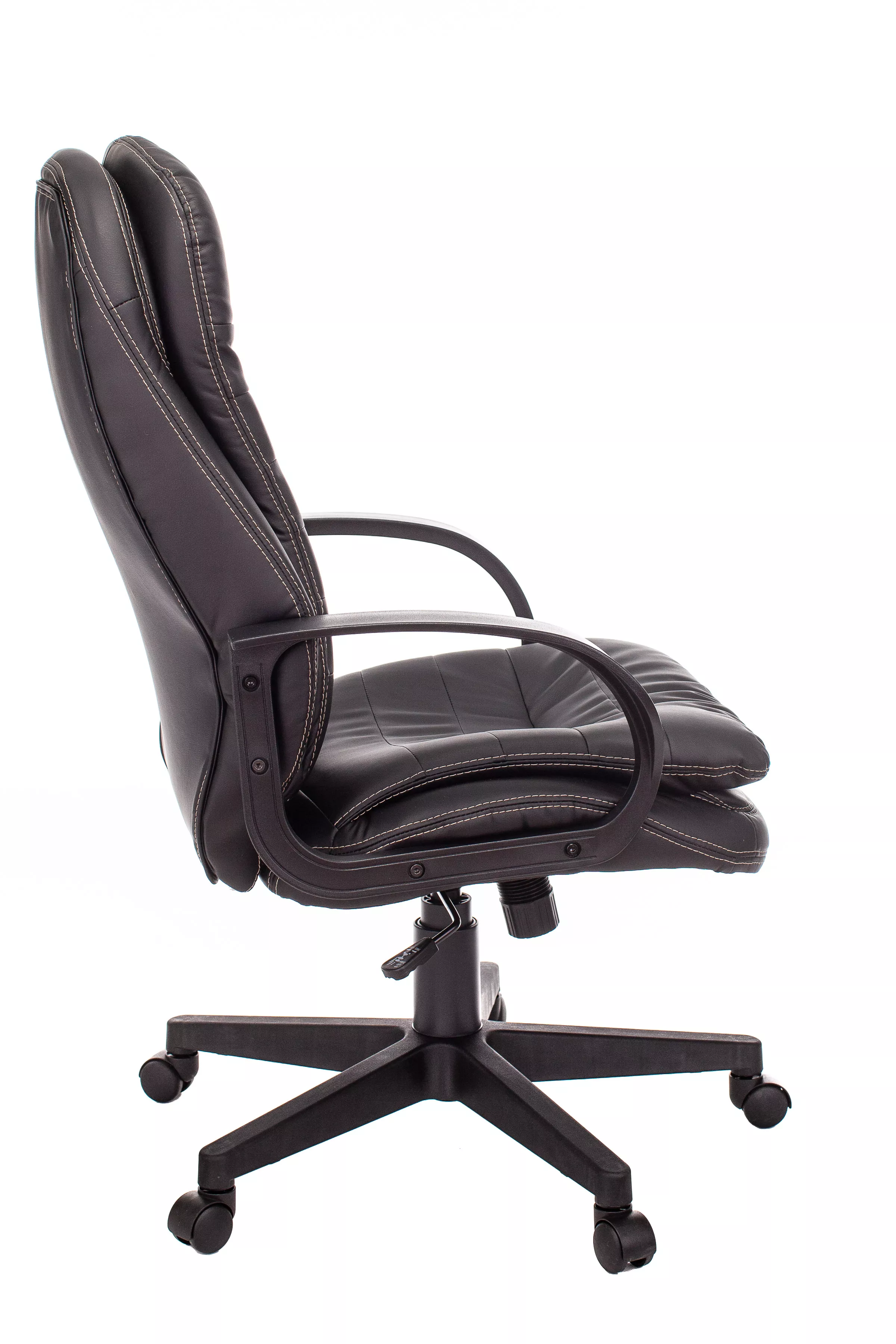 Обивка кресла выполнена из высококачественной экокожи черного цвета, которая не только стильно смотрится, но и легко чистится. Спинка кресла отделена от сиденья, что позволяет обеспечить лучшую вентиляцию и комфорт при длительном сидении. Высота кресла варьируется от 1065 мм до 765 мм с подлокотниками, а высота сиденья составляет 495 мм. Ширина сиденья — 565 мм, а глубина — 460 мм, что обеспечивает достаточное пространство для комфортного размещения.