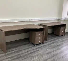 Рабочие места: Оборудованы мебелью серии Riva — тумбой и шкафами в цвете антрацит, которые сочетают удобство и строгий деловой дизайн.