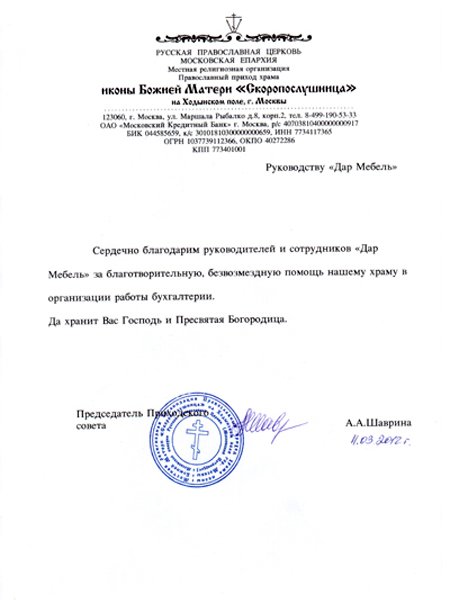 Сердечно благодарим руководителей и сотрудников "Дар МЕБЕЛЬ" за благотворительную, безвозмездную помощь нашему храму в организации работы бухгалтерии. Да хранит Вас Господь и Пресвятая Богородица.
