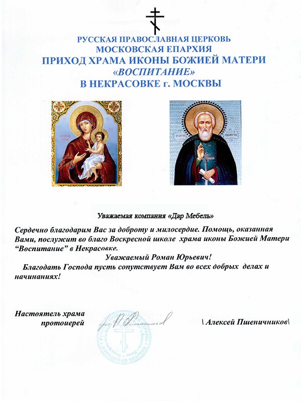Уважаемая компания "ДАР МЕБЕЛЬ" Сердечно благодарим Вас за доброту и милосердие. Помощь оказанная Вами, послужит во благо Воскресной школе храма иконы Божией Матери "Воспитание" в Некрасовке Уважаемый Роман Юрьевич! Благодать Господа пусть сопутствует Вам во всех добрых дела и начинаниях!