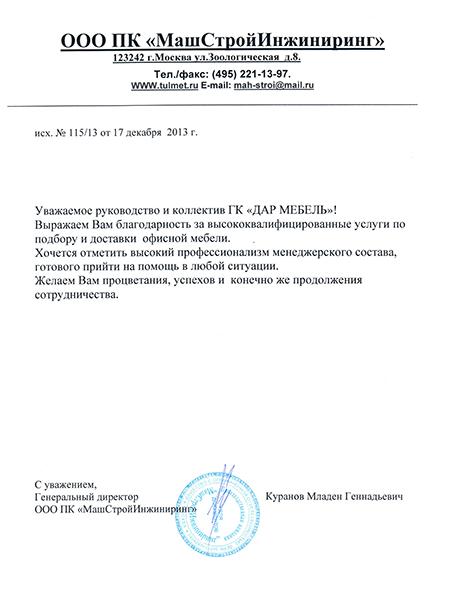 Уважаемое руководство и коллектив ГК "ДАР МЕБЕЛЬ" Выражаем Вам саму искреннюю благодарность и за высококвалифицированные услуги по подбору и доставке офисной мебели. Хочется отметить компетентность и ответственное отношение к работе сотрудников Вашей компании. Благодаря их консультациям мы смогли быстро и по выгодной цене приобрести очень качественную мебель. Желаем успехов и процветания Вашей компании.