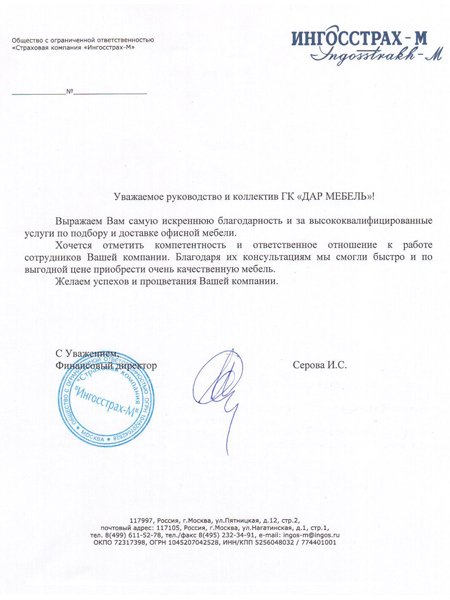 Выражаем Вам самую искреннюю благодарность, и за высококвалифицированные услуги по доставке офисной мебели. Хочется отметить компетентность и ответственное отношение к работе сотрудников Вашей компании. Благодаря их консультациям мы смогли быстро и по выгодной цене приобрести очень качественную мебель. Желаем успехов и процветания Вашей компании. www.ingos-m.ru