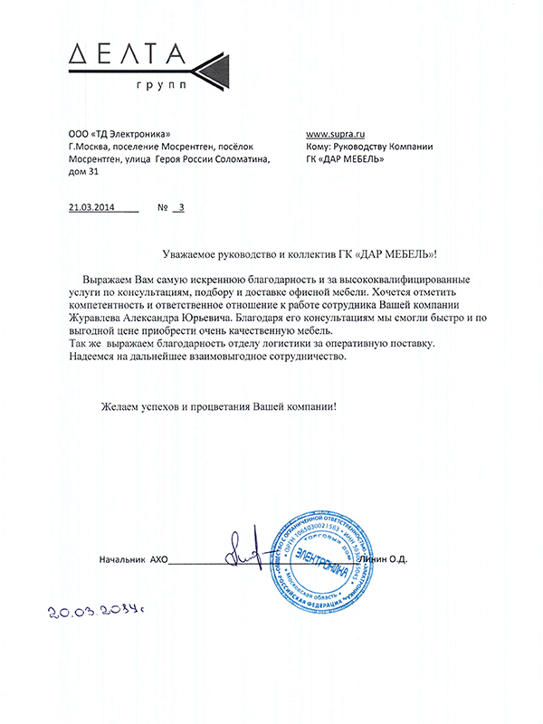 Уважаемое руководство и коллектив ГК "ДАР МЕБЕЛЬ" Выражаем Вам самую искреннюю благодарность и за высококвалифицированные услуги по подбору, доставке и сборке офисной мебели. Хочется отметить компетентность и ответственное отношение к работе Вашей компании Журавлева Александра Юрьевича . Благодаря его консультациям мы смогли быстро и по выгодной цене приобрести очень качественную мебель. Так же выражаем благодарность отделу логистики за оперативную поставку и качественную сборку офисной мебели. Надеемся на дальнейшее плодотворное сотрудничество. Желаем успехов и процветания Вашей компании.