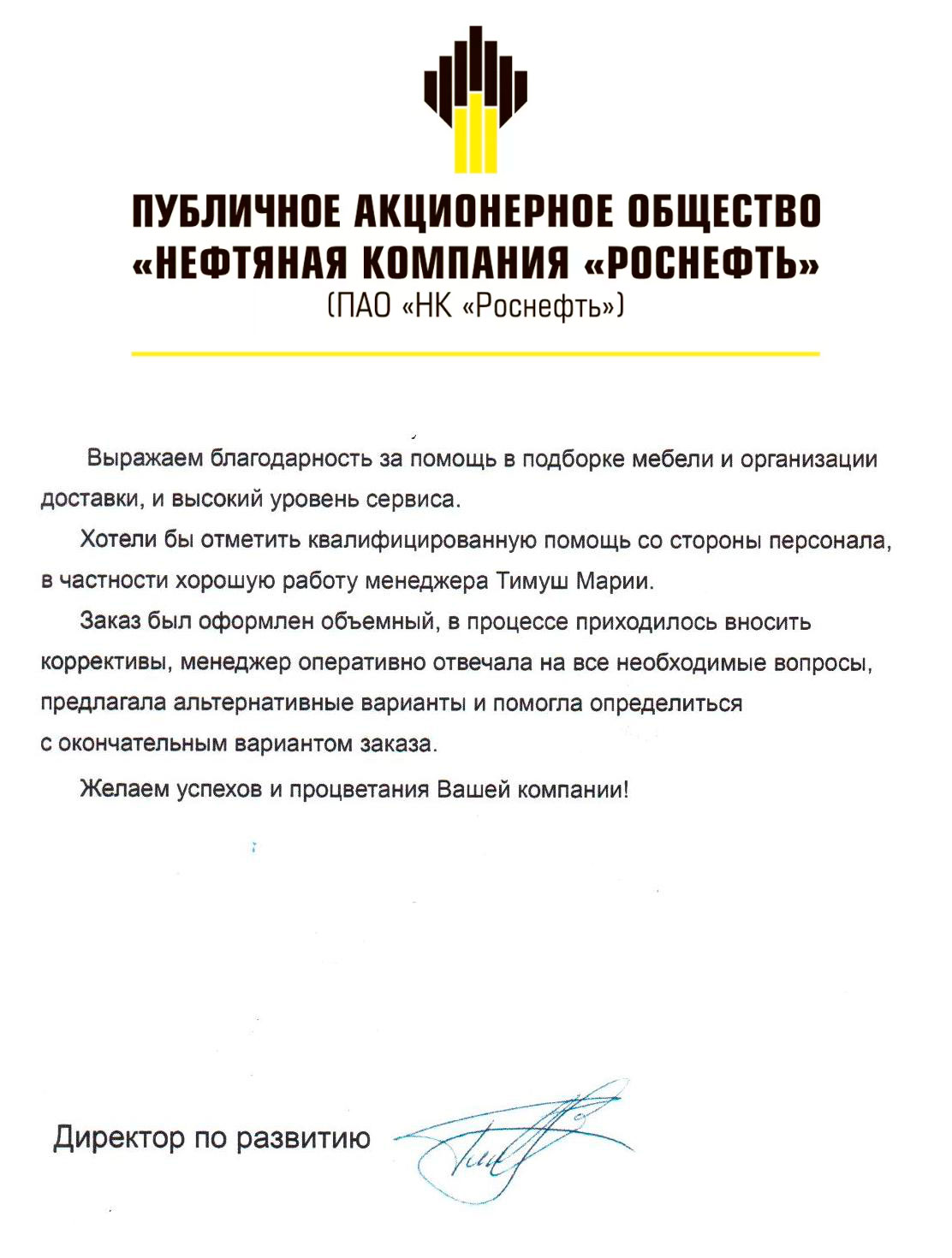 Выражаем благодарность за помощь в подборке мебели и организации доставки, и высокий уровень сервиса. Хотели бы отметить квалифицированную помощь со стороны персонала, в частности хорошую работу менеджера Тимуш Марии. Заказ был оформлен объемный, в процессе приходилось вносить коррективы, менеджер оперативно отвечала на все необходимые вопросы, предлагала альтернативные варианты и помогла определиться с окончательным вариантом заказа. Желаем успехов и процветания Вашей компании. www.rosneft.ru
