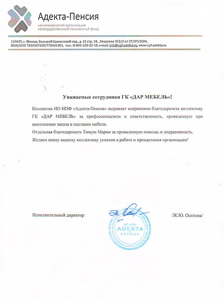 Коллектив НО НПФ "Адекта-пенсия" выражает искреннюю благодарность коллективу ГК "Дар Мебель" за профессионализм и ответственность, проявленную при выполнении заказа и поставки мебели. Отдельная благодарность Тимуш Марии за проявленную помощь и оперативность. Желаем всему вашему коллективу успехов в работе и процветания организации.