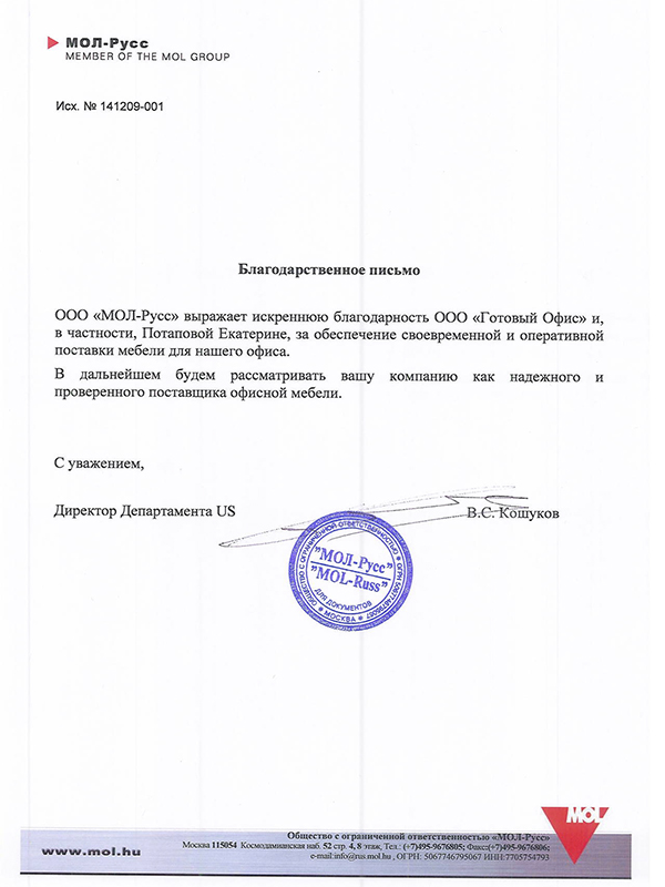 ООО "МОЛ-РУСС" выражает искреннюю благодарность ООО "ГОТОВЫЙ ОФИС" и, в частности, Потаповой Екатерине, за обеспечение своевременной и оперативной поставки мебели для нашего офиса. В дальнейшем будем рассматривать Вашу компанию как надежного и проверенного поставщика офисной мебели.