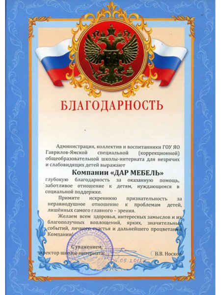 Администрация, коллектив и воспитанники ГОУ ЯО Гаврилов-Ямской специальной (коррекционной) общеобразовательной школы-интерната для незрячих и слабовидящих детей выражают Компании "ДАР МЕБЕЛЬ" глубокую благодарность за оказанную помощь, заботливое отношение к детям, нуждающимся в социальной поддержке. Примите искреннюю признательность за неравнодушное отношение к проблемам детей, лишённых самого главного - зрения. Желаем всем здоровья,интересных замыслов и их благополучных воплощений, ярких, значительных событий, личного счастья и дальнейшего процветания Компании!
