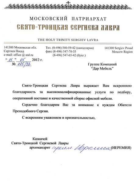 Свято-Троицкая Сергиева Лавра выражает Вам искреннюю благодарность за высококвалифицированные услуги по подбору, оперативной поставке качественной сборке офисной мебели. Сердечно благодарим Вас за внимание к нуждам обители Преподобного Сергия. С искренним уважением и признательностью.
