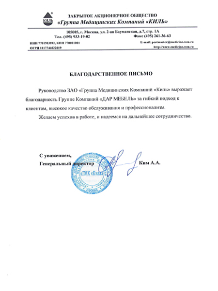 Руководство ЗАО "Группа Медицинских Компаний "Киль" выражает благодарность Группе Компаний "Дар Мебель" за гибкий подход к клиентам,высокое качество обслуживания и профессионализм. Желаем успехов в работе, и надеемся на дальнейшее сотрудничество.