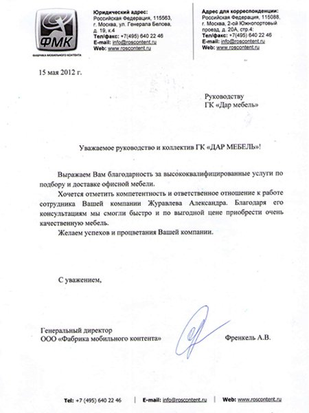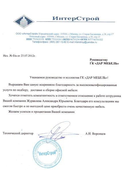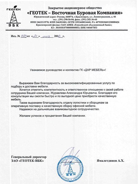 Уважаемое руководство и коллектив ГК "ДАР МЕБЕЛЬ" Выражаем Вам самую искреннюю благодарность и за высококвалифицированные услуги по подбору, доставке и сборке офисной мебели. Хочется отметить компетентность и ответственное отношение к работе Вашей компании Журавлева Александра Юрьевича. Благодаря его консультациям мы смогли быстро и по выгодной цене приобрести очень качественную мебель. Так же выражаем благодарность сборщикам и отделу логистики. . Желаем успехов и процветания Вашей компании.
