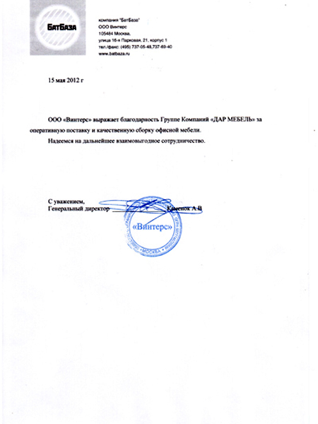 ООО "Винтерс" выражает благодарность Группе Компаний "Дар Мебель"за оперативную поставку и качественную сборку офисной мебели. Надеемся на дальнейшее взаимовыгодное сотрудничество.